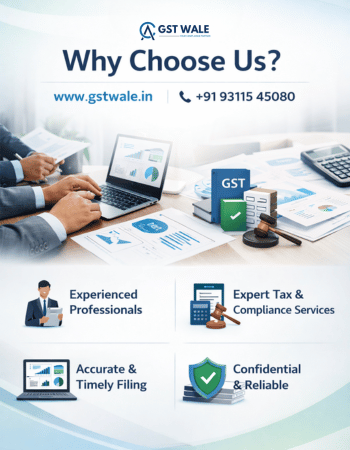 GST Wale is a trusted platform dedicated to providing complete CA, GST, and business compliance services across India. We help startups, entrepreneurs, and established businesses manage their legal and financial requirements with ease and confidence. From company registration, GST registration, and ITR filing to trademark, compliance, and advisory services, our goal is to simplify complex processes and deliver accurate, timely solutions.